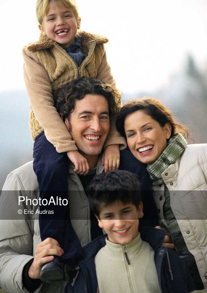 Adult man and woman standing with two children, little girl on man's shoulders, little boy standing in front, portrait © Eric Audras