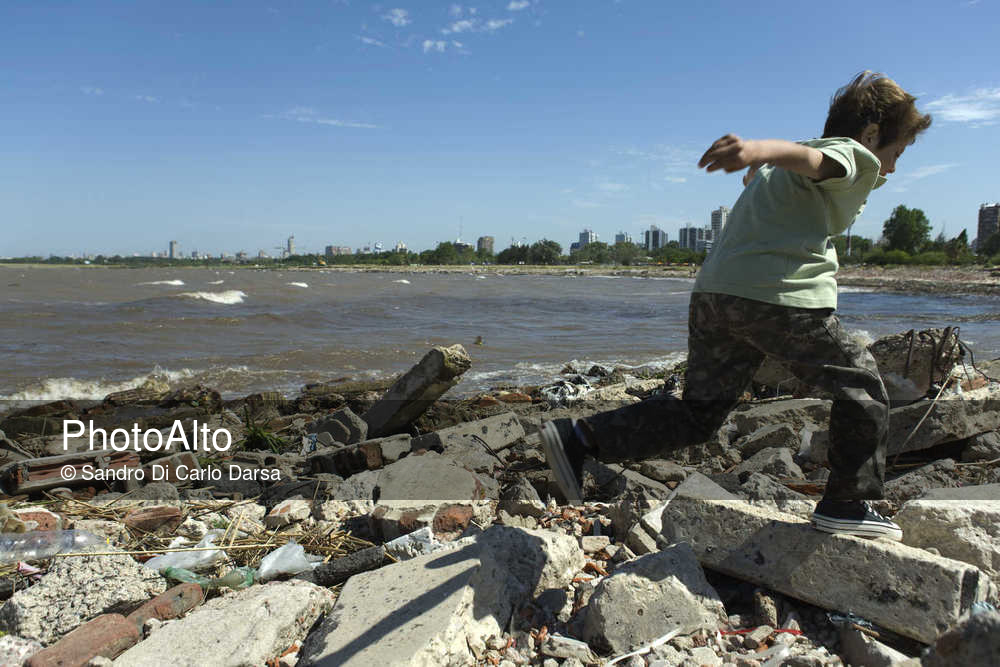 Boy running on shore littered with debris, city in background © Sandro Di Carlo Darsa