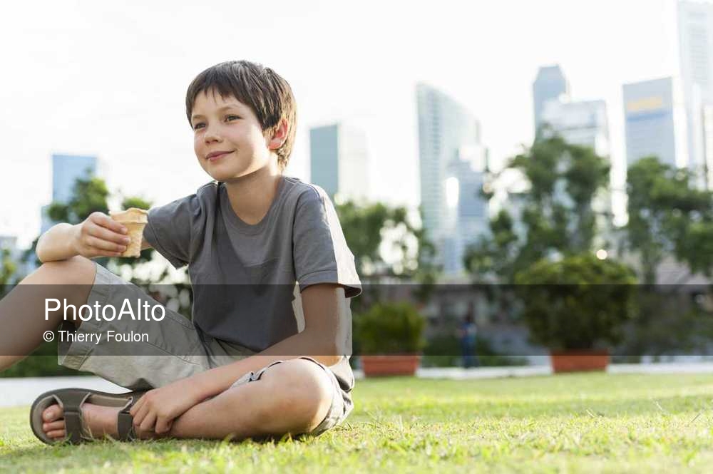 Boy sitting on grass in park, city skyline in background © Thierry Foulon