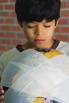 Boy wrapping gauze around plant, cropped view © Laurence Mouton