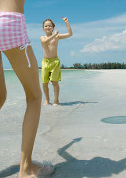 Boys running next to surf on beach © Odilon Dimier