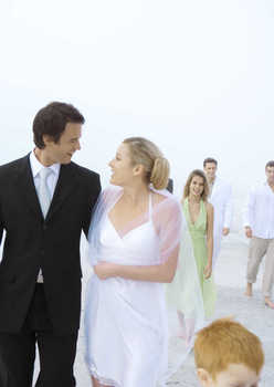 Bride and groom embracing on beach © Laurence Mouton
