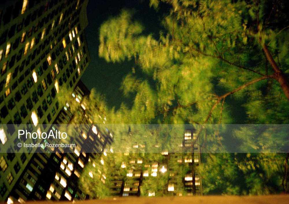 Building lights and tree at night, view from below, blurred. © Isabelle Rozenbaum