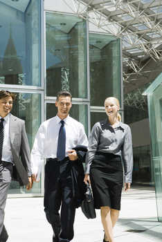 Business colleagues in hallway, woman laughing, man in background using cell phone © Sigrid Olsson
