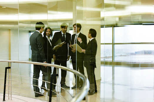 Business executives standing together discussing documents © Sigrid Olsson