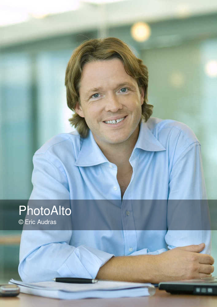 Businessman sitting at desk, smiling at camera, portrait © Eric Audras