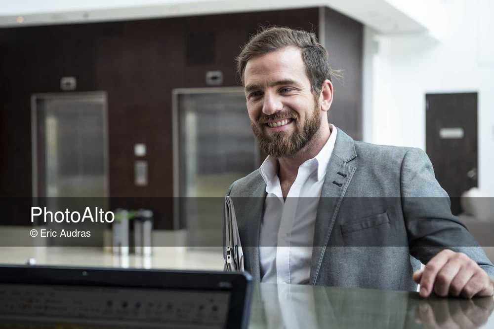 Businessman standing at hotel reception counter © Eric Audras