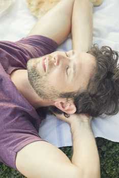 Businesswoman lying in grass, eyes closed © Eric Audras