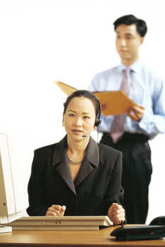 Businesswoman wearing headset and using laptop, making ok gesture © James Hardy