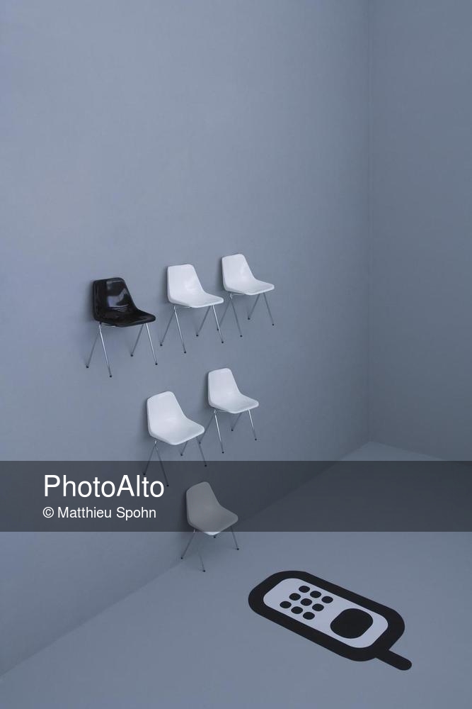 Chairs arranged in form of upside down pyramid in front of large cell phone, one chair black, the rest white © Matthieu Spohn