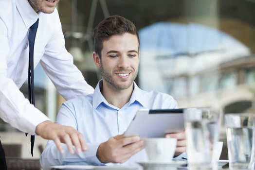 Colleagues looking at digital tablet together in office © Sigrid Olsson