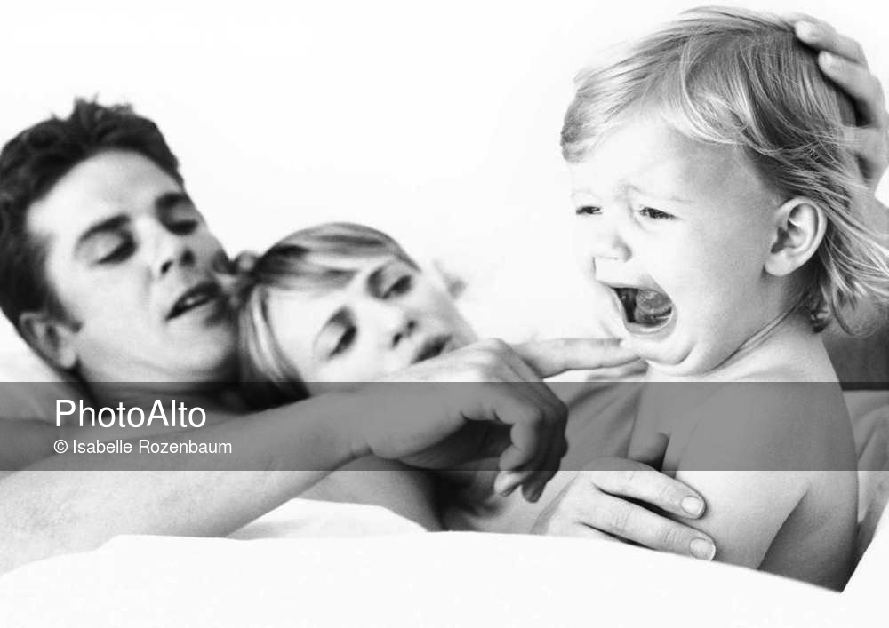 Couple lying in bed, baby crying, b&w © Isabelle Rozenbaum