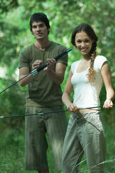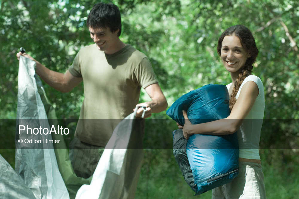Couple setting up campsite in wilderness area © Odilon Dimier