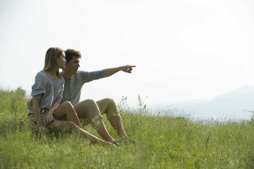 Couple taking escalator in shopping mall, man pointing out of frame © James Hardy