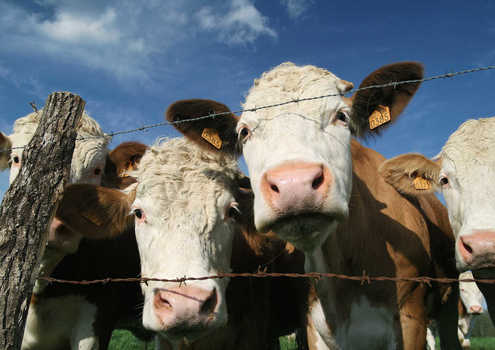 Cows looking through barbed wire fence, close-up © Yves Regaldi
