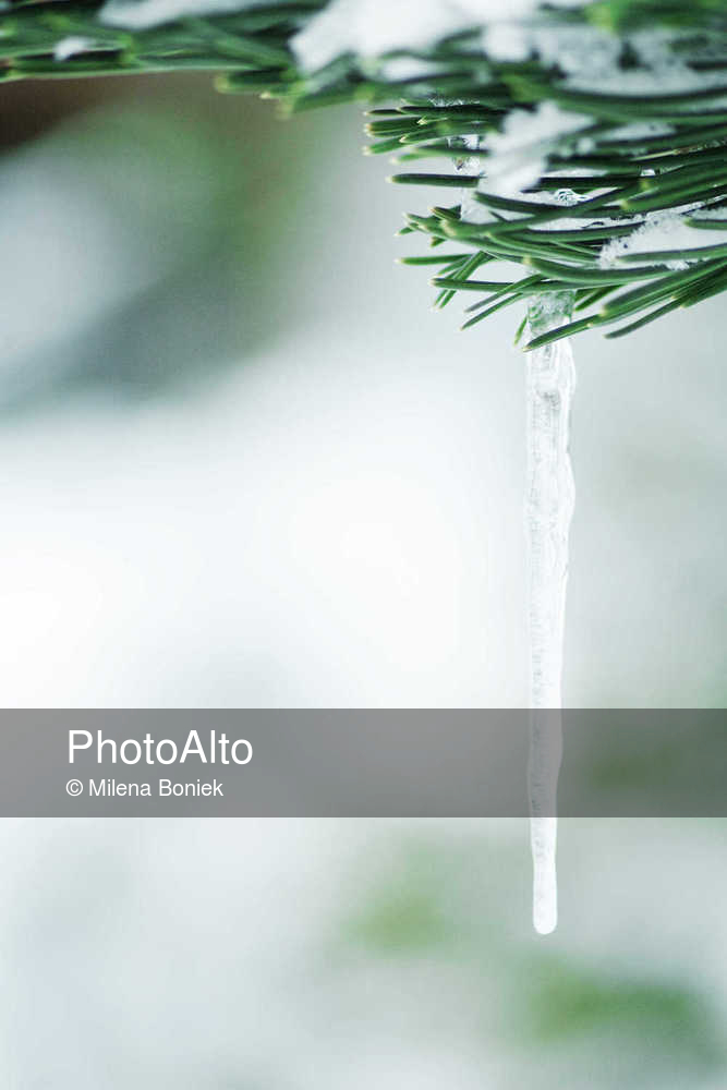 Evergreen branch covered with snow and icicles © Milena Boniek