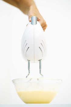 Father and two children baking together, man using electric mixer © Laurence Mouton