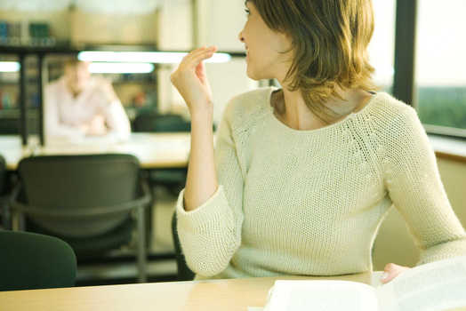 Female college student sitting at table in library, resting on book © Sigrid Olsson