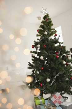 Festively wrapped gifts stacked in front of Christmas tree © Frédéric Cirou