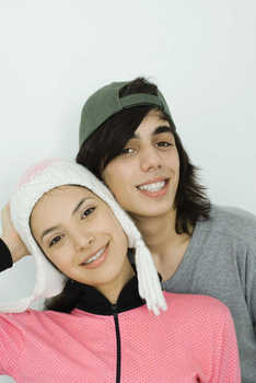 Four young friends sitting on grass, side by side, looking over shoulders at camera © Odilon Dimier