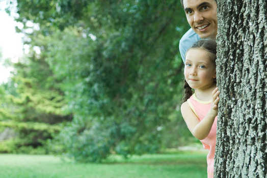 Girl and father peeking around tree trunk © Eric Audras