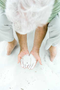 Girl playing with chalk, hunched over, high angle view © Odilon Dimier