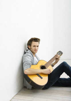 Group of young friends sitting by tree together, one playing guitar © Odilon Dimier