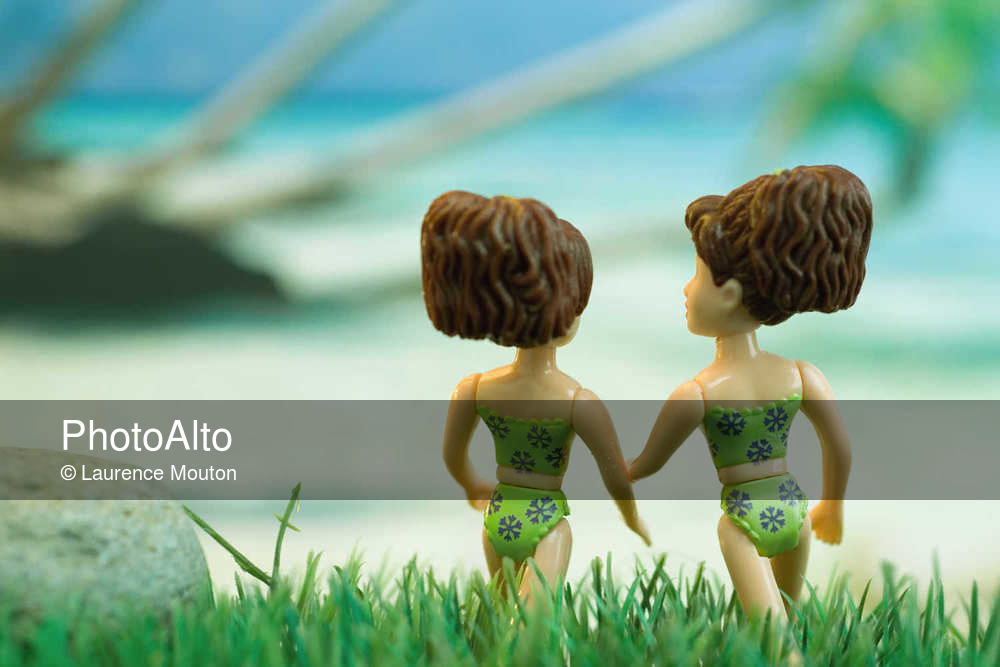 Identical figurines walking toward beach, rear view © Laurence Mouton