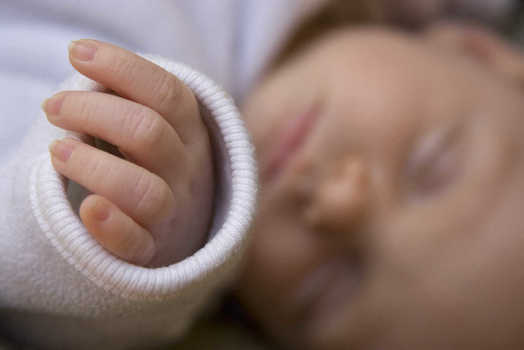 Infant sitting in crib, focus on hand © Philippe Dureuil