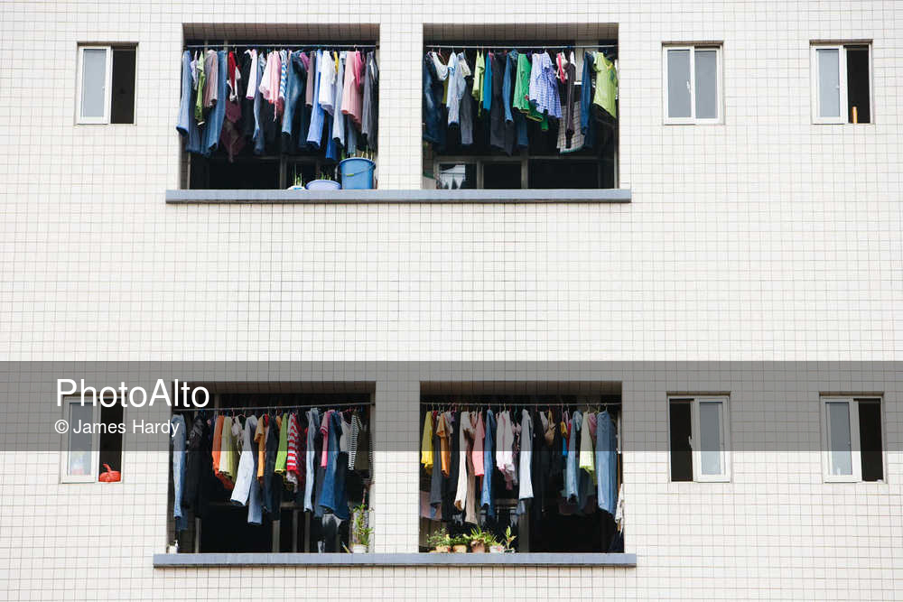 Laundry hanging to dry in balconies of apartment building © James Hardy