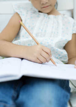 Little boy sitting at table, drawing with colored pencil © Sigrid Olsson
