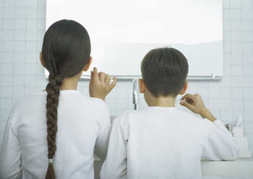 Little girl brushing teeth with electric toothbrush, focus on reflection in mirror © Mieke Dalle