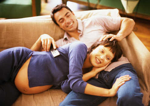 Man and pregnant woman on sofa, high angle view © John Dowland