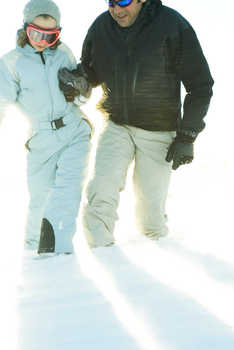 Man embracing teenage daughter, both kneeling in snow © Laurence Mouton