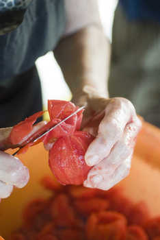 Man peeling orange for baby girl, cropped © Philippe Dureuil