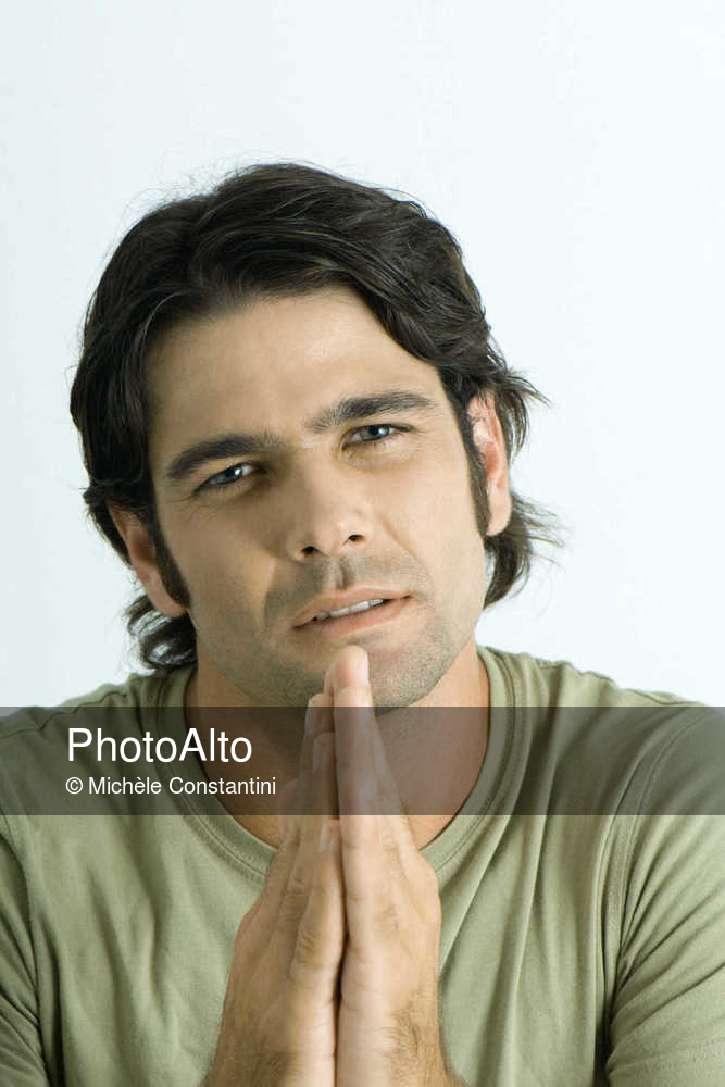 Man pleading with hands together, looking at camera, portrait © Michèle Constantini