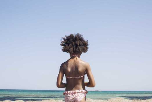 Man sitting near sand castle, looking out to sea © Katarina Sundelin