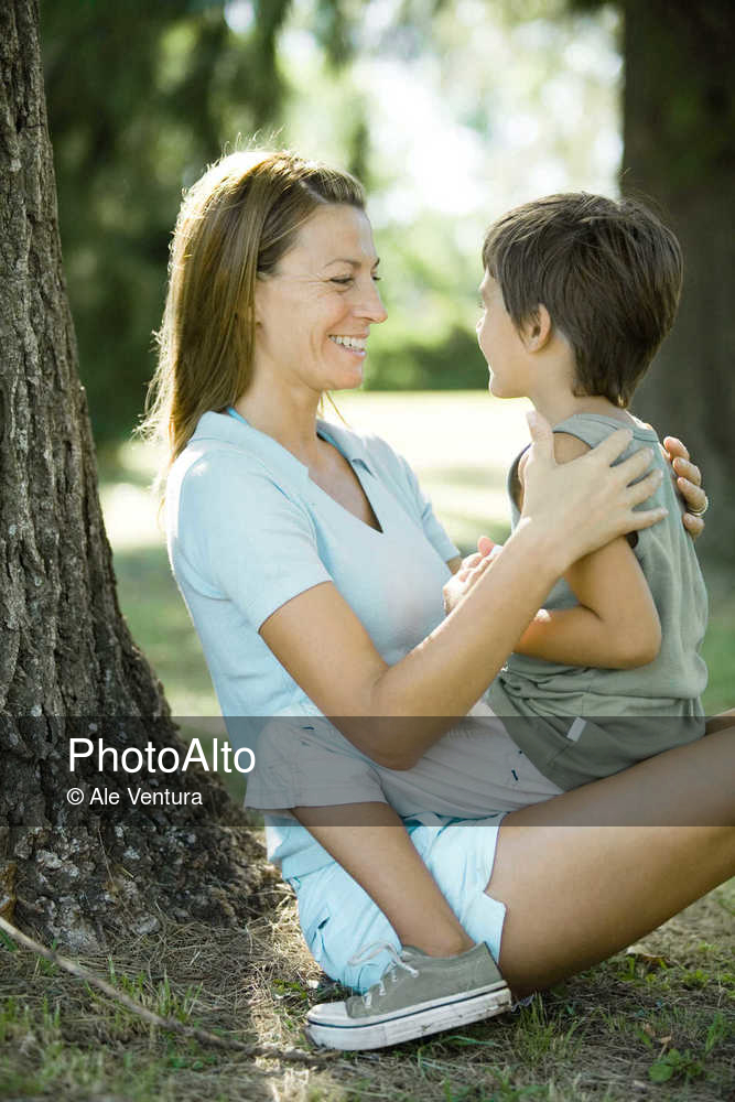 Mother and son outdoors, boy sitting on woman's lap © Ale Ventura