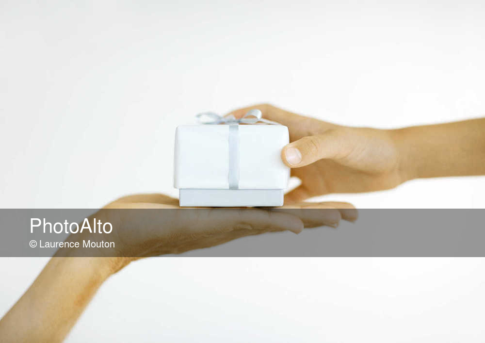 One person handing second person gift, close-up of hands © Laurence Mouton