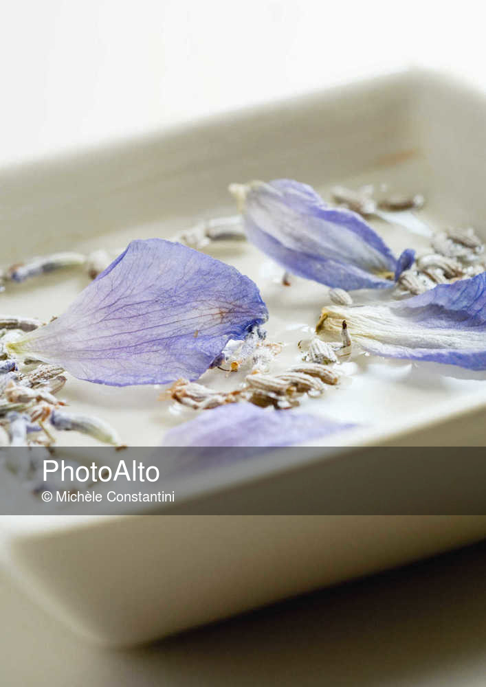 Petals and dried lavender floating in dish © Michèle Constantini