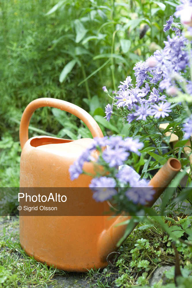 Plastic watering can by flowers © Sigrid Olsson