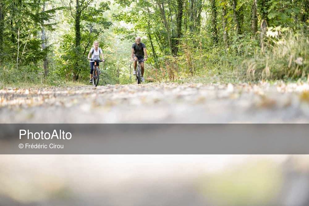 Portrait of smiling mature couple riding bicycles in forest © Frédéric Cirou