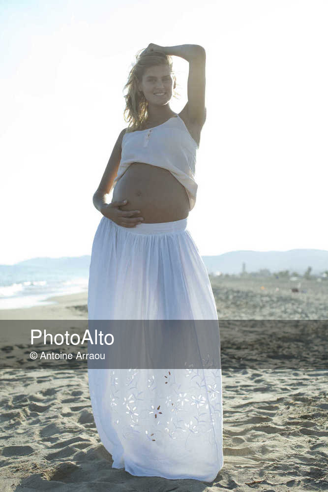 Pregnant woman standing on beach with hand on belly © Antoine Arraou