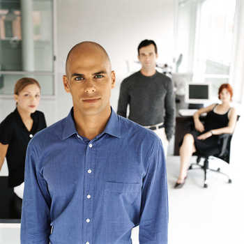 Professional woman smiling at camera, colleagues in background © Ale Ventura