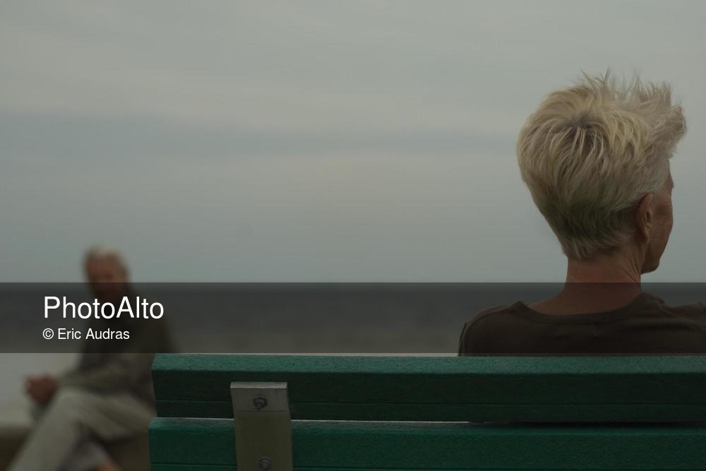 Senior woman sitting alone on bench, rear view, man sitting in background © Eric Audras