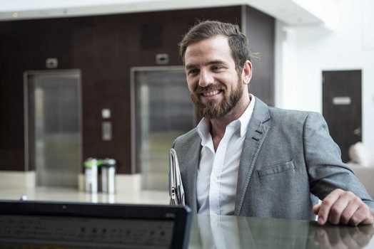 Smiling businessman standing in hotel lobby © Eric Audras