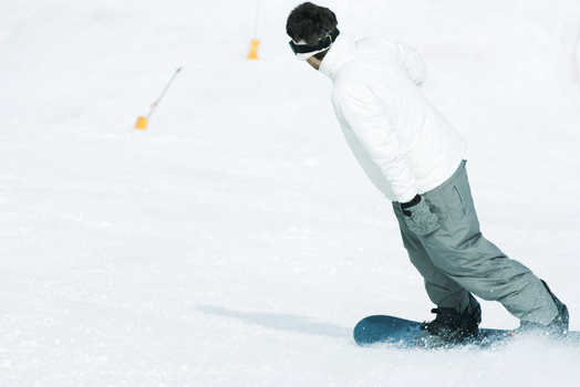 Teenage girl snowboarding on ski slope, full length © Laurence Mouton