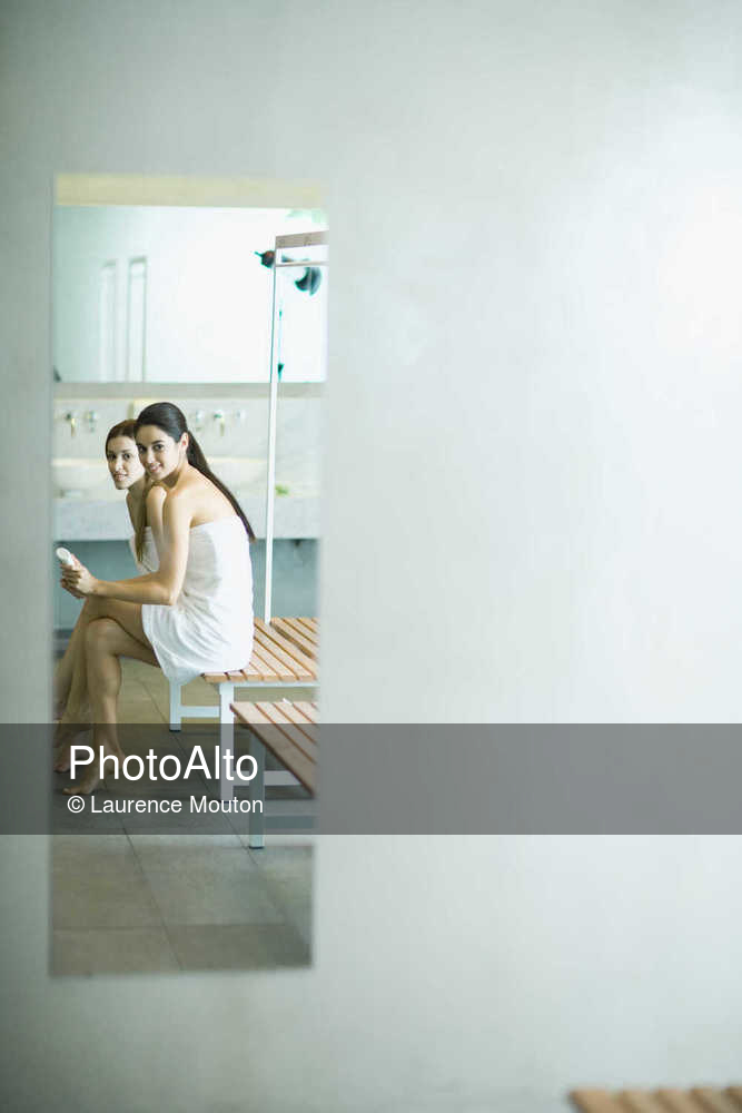 Two young women wrapped in towels, sitting on bench in locker rooms, reflected in mirror © Laurence Mouton