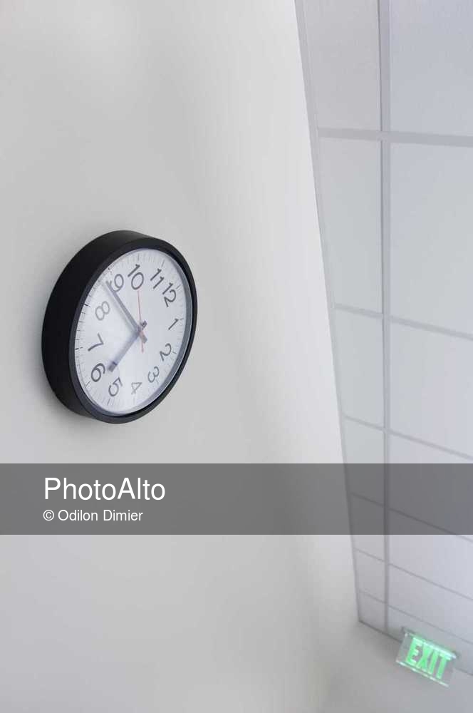 Wall clock and exit sign in office © Odilon Dimier