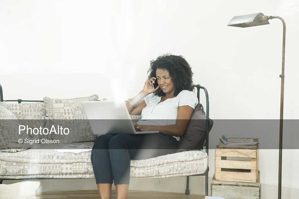 Woman chatting on cell phone and using laptop computer at home © Sigrid Olsson